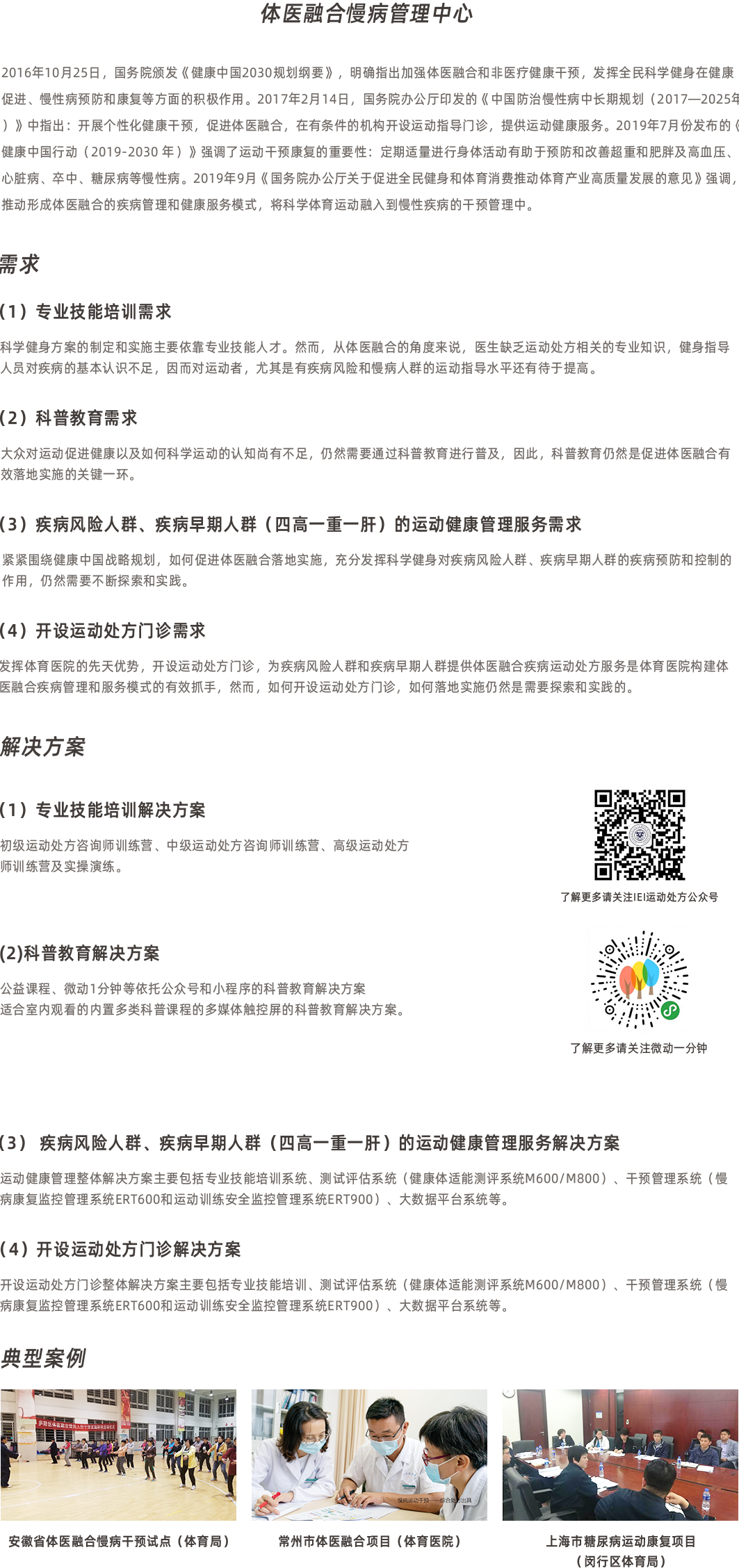 健康体适能测评与运动管理由中国健康管理促进基金会研究开发(课题编号:CHPF2014-FITEX),主要针对常见慢性病,利用体检医疗指标结合运动测评指标为患者开具安全、科学、个性化运动处方,为慢病锻炼提供运动整体解决方案。